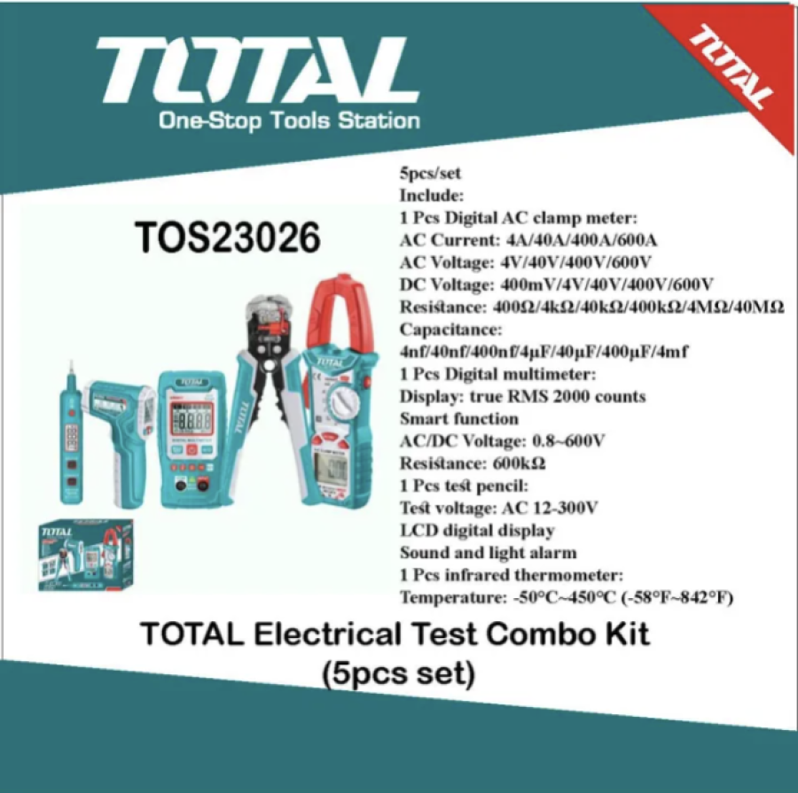 Product details of TOTAL Electrical Test Combo Kit (5pcs set) TOS23026 5pcs/set Include: 1 Pcs Digital AC clamp meter: AC Current: 4A/40A/400A/600A AC Voltage: 4V/40V/400V/600V DC Voltage: 400mV/4V/40V/400V/600V Resistance: 400Ω/4kΩ/40kΩ/400kΩ/4MΩ/40MΩ Capacitance: 4nf/40nf/400nf/4μF/40μF/400μF/4mf 1 Pcs Digital multimeter: Display: true RMS 2000 counts Smart function AC/DC Voltage: 0.8~600V Resistance: 600kΩ 1 Pcs test pencil: Test voltage: AC 12-300V LCD digital display Sound and light alarm 1 Pcs infrared thermometer: Temperature: -50°C~450°C (-58°F~842°F)