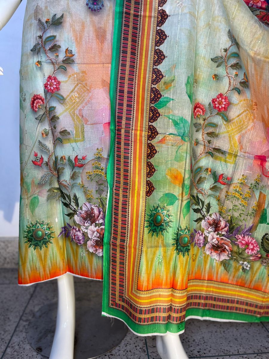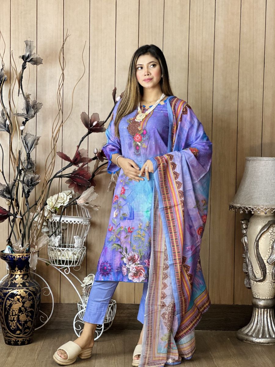 Pure cotton digital print, unstitched, three pieces with embroidery sequence work